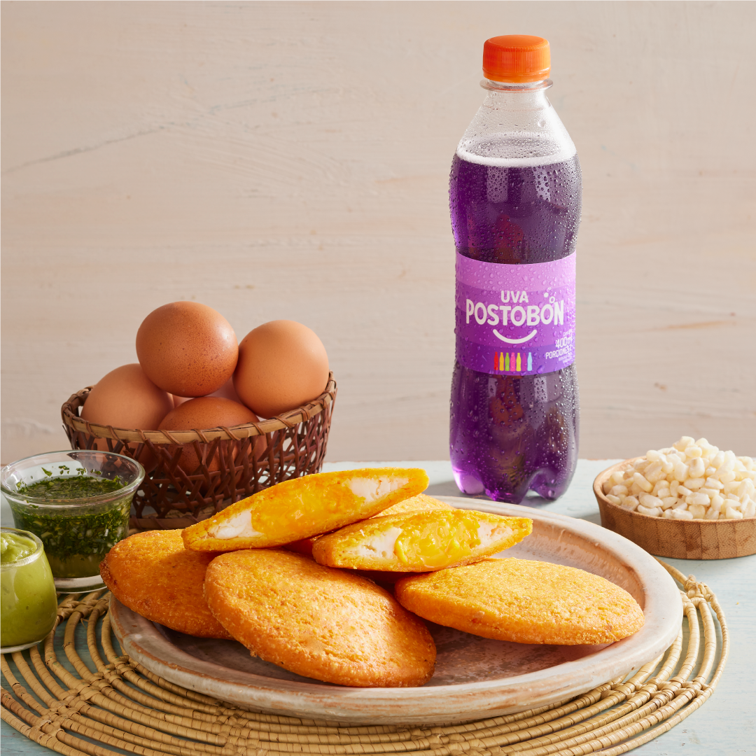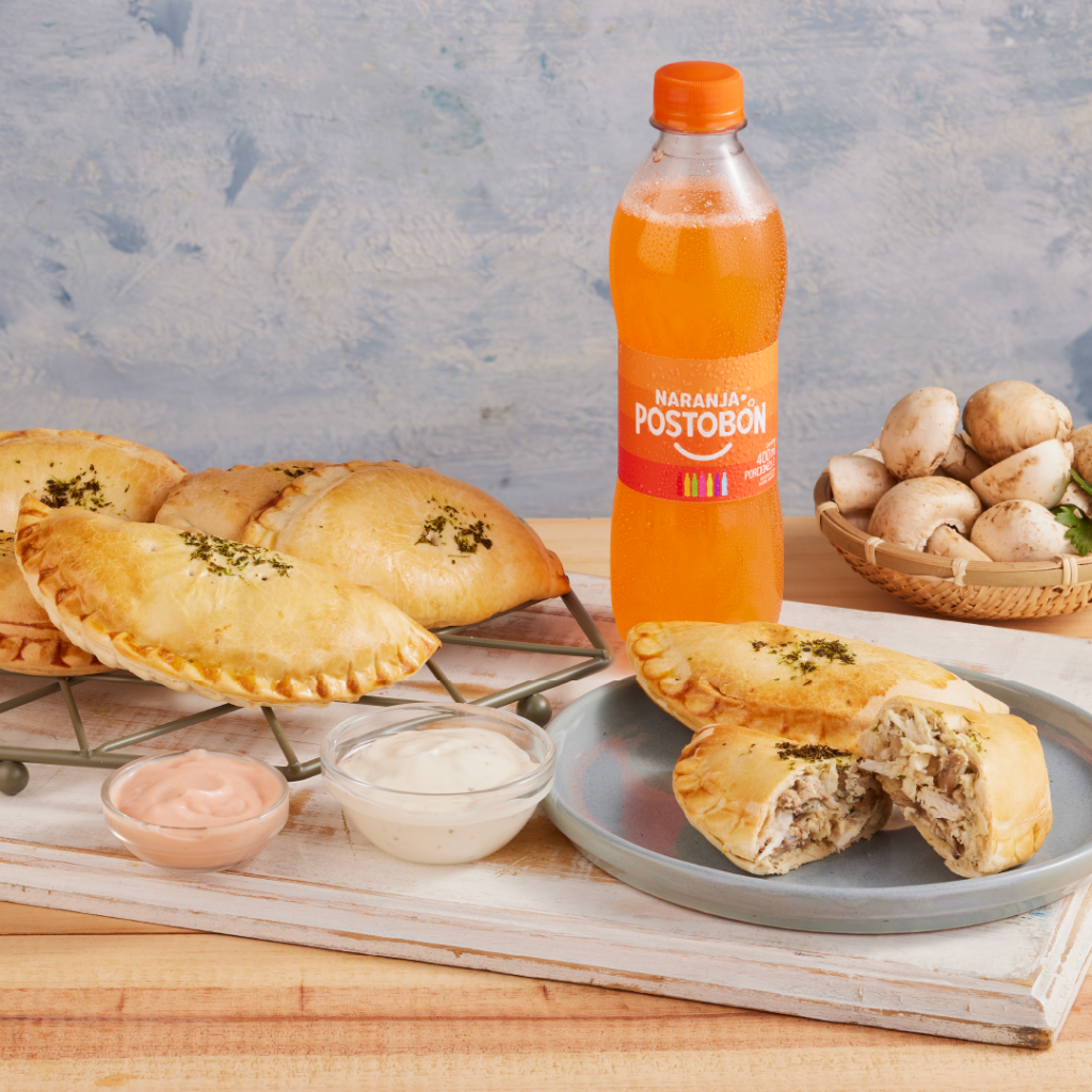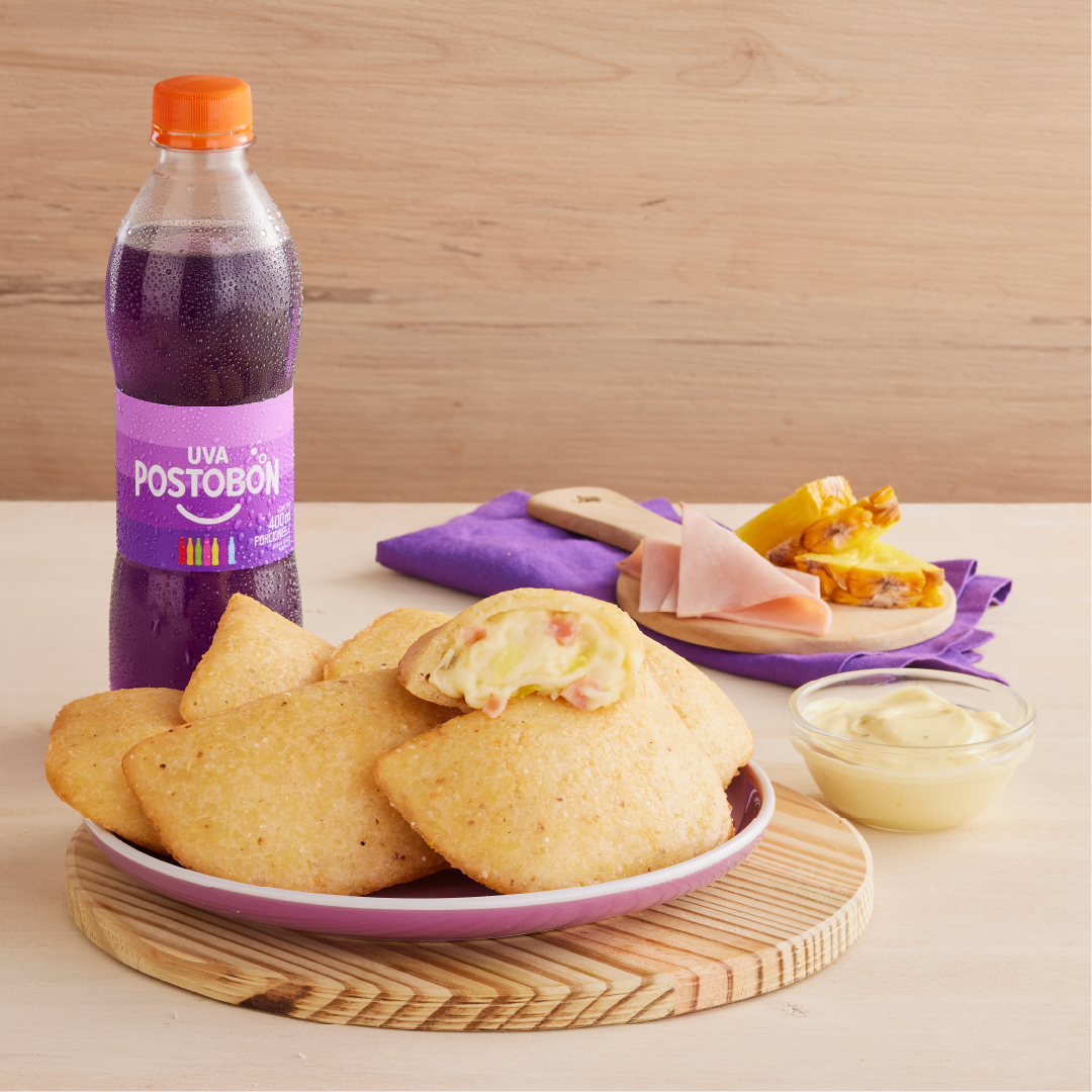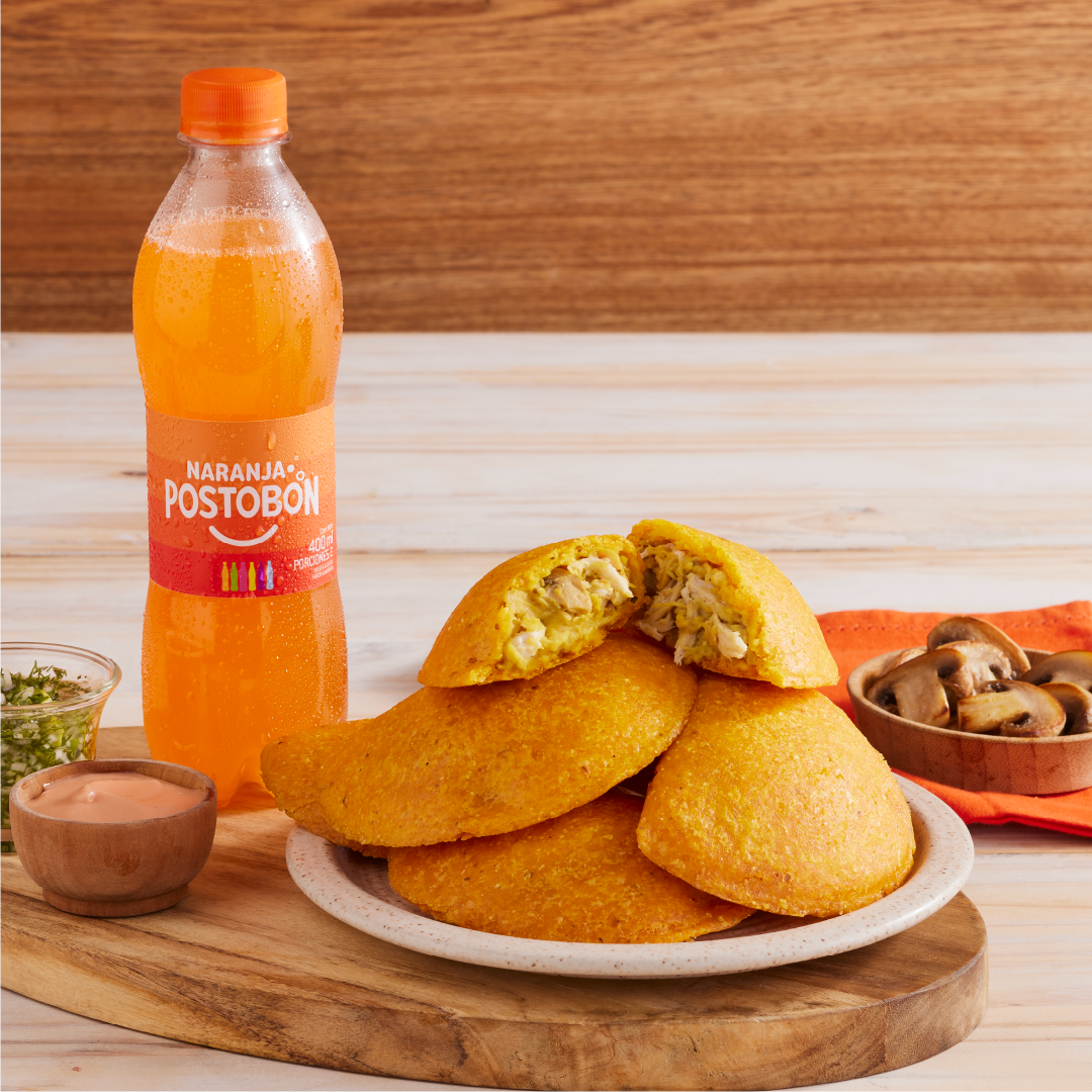 Sabrosa empanada de maíz peto con filete de pollo desmechado, queso doble crema, champiñones finamente cortados en salsa bechamel, papa criolla y guiso de la casa.