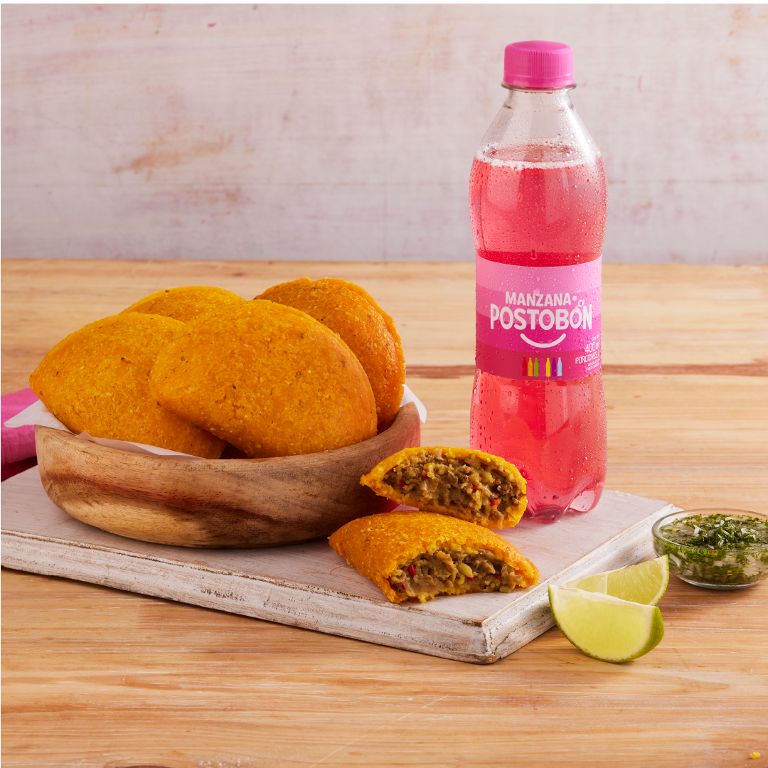Irresistible empanada de maíz peto con carne de res, toque picante, papa pastusa y guiso de la casa.