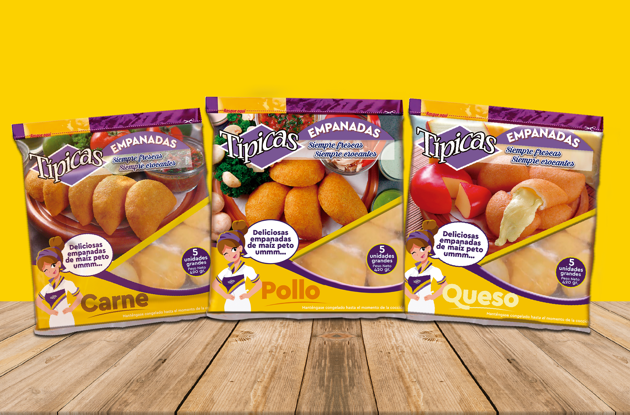 Empanadas de 100 gramos de carne, queso o pollo.